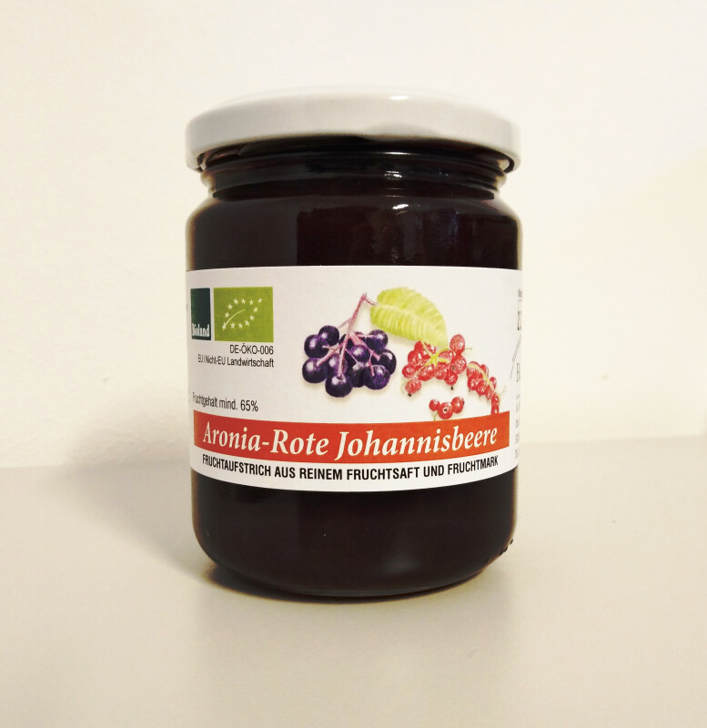 32,5 % Aroniasaft, 32,5 % Mark aus roter Johannesbeere, Zucker, Zitronensaft, Geliermittel : Apfelpektin - aus regionaler Bioland-Herstellung